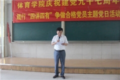活动第二项,体育学院党委书记杨杰进行了“四讲四有”主题教育。杨书记指出,新形势下,合格党员的标准是讲政治、有信念,讲规矩、有纪律,讲道德、有品行,讲奉献、有作为。在“两学一做”学习教育活动深入开展中,每一个党员都要以“四讲四有”标准衡量自己、检视自己,学习贯彻好党章,增强政治意识、大局意识、核心意识、看齐意识,强化责任担当,落细落小落实,切实提升履职能力、创新能力和服务能力。围绕教学科研等业务工作,充分弘扬“四讲四有”,在教职工中形成氛围,在学生中带好头,保持持续振奋的精神和良好的作风,应对矛盾和问题要深思熟虑,准确把握,寻找突破口,要一如既往,任劳任怨,能够吃苦、善于吃苦,锲而不舍地去完成教学科研等各项工作任务。同时,要增强创新意识,在观念、资料、方式方法和机制等方面的摒弃滞后观念、陈旧方法的束缚,创造性的开展工作。