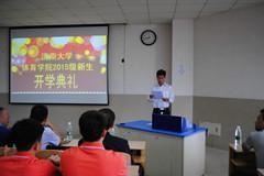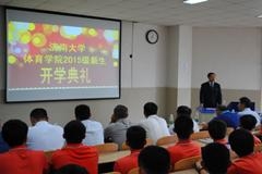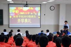 9月5日上午,体育学院2015级新生开学典礼于第十一教五段101室隆重召开。院领导周明、杨磊、张良红、亓圣华、刘正泉共同出席了此次典礼。参加典礼的还有办公室主任,学办主任,团委书记,系部主任,辅导员,新生班主任,助理班主任及15级新生。开学典礼由体育学院党委副书记、副院长张良红主持。 伴随嘹亮的校歌,15级新生开学典礼拉开帷幕。张良红副书记首先代表学院向15级新生表示衷心的祝贺,并隆重介绍了出席典礼的领导老师。紧接着,杨院长致辞,他详细地介绍了体育学院的专业特色、师资力量及就业前景,并向同学们提出了美好愿望。杨院长指出,大学是具有多项功能的高等教育机构,希望新生能正确认知大学,从被动学习向主动学习和研究性学习转变。接着老生代表体育1303班班长、学生会主席上台发言,针对大学生活中遇到的问题与困惑提出了全面切实的建议,希冀同学们能在大学的广阔舞台上舞动自己更美好的风采。最后,典礼在热烈的掌声中圆满结束。 此次开学典礼吹响了新的大学生活的号角,为广大新老师生提供了一个交流的平台,有助于新生树立明确的人生目标、积极改造并提升自我,同时也为接下来各项新生工作的展开打下了基础。(编辑:黄会)(校对:邢禄建)