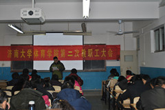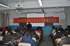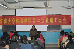 2013年1月9日 ,体育学院第二次教职工大会在第4教学楼102教室顺利召开。体育学院全体教职工出席了本次会议,会议由体育学院党委书记周明主持。 会议伊始,周明书记对此次教职工大会的召开表示祝贺。首先,体育学院院长杨磊受学院党委委托作了《体育学院2012年工作报告》。他充分肯定了体育学院2012年取得的成绩,提出了今后建设发展的指导性意见。他希望学院认真学习贯彻党的十八大精神,抓住学校快速发展的机遇,以此次教职工大会为契机,完善制度,明确目标,扎实工作,追求卓越,为建设高水平学院而不懈努力。随后,由济南大学工会体育学院分会主席路平作《2012年体育学院分会工作报告》。体育学院分会主席路平表示:2012年体育学院分会努力提高教师的思想素质,建设一支优秀的教师队伍;坚持院务公开,加强院风建设,发挥公会的监督功能;急教工所急,想教工所想,把工会建成温暖的职工之家。随后,由周明书记主持,表决并通过了由体育学院院长杨磊担任济南大学体育学院教职工及工会会员代表,由学院路平主席担任济南大学体育学院工会会员代表。最后,由周明书记作了“承前启后,继往开来,集思广益,共谋发展”的总结讲话。他指出,本次教职工大会通过大家的共同努力,圆满完成了各项议程,达到了统一思想、开拓思路、振奋精神、凝聚力量的目的。大会在全体教职工热烈的掌声中顺利结束。 这次会议是体育学院政治生活中的一件大事,对于激发广大教职工的主人翁意识,集思广益、群策群力推动学院事业发展,具有十分重要的意义。