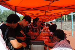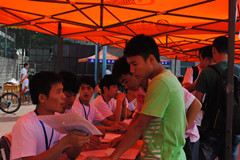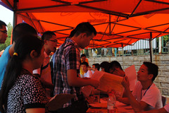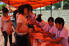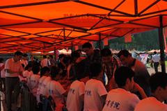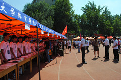 田径场上济南大学各学院的“大本营”鳞次栉比地排列,方便新生寻找自己的学院,体育学院的报到处设置在田径场东北角。体育学院特设专家咨询区,为学生、家长答疑;为每个班级安排了助理班主任;并安排了各个专业高年级的学哥、学姐作为志愿者在现场详细告知每个新生入学需要注意的有关事项,并帮助他们更好地熟悉校园。体育学院还特意在迎新“大本营”附近为家长搭建了许多遮阳棚,供他们休息。与往年一样,学校设置了绿色通道服务站为新生们提供贴心服务。