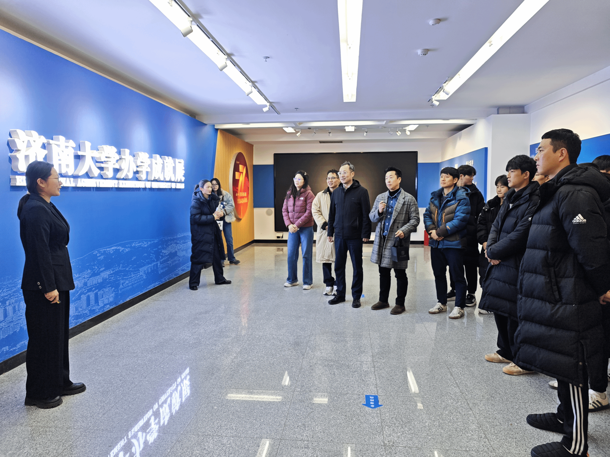 活动伊始,驻华韩国文化院郑钟元、韩国飞翔跆拳道队团长全寅律、总教练沈贞浩等一行,在院长亓圣华陪同下,走进济南大学办学成就展。从办学历史的时光长廊到学科建设的成果展板,从人才培养到科研创新,来宾们在讲解中全方位了解学校发展脉络,尤其对学校在专业建设、文化活动、产学研融合等方面的成果给予高度评价,为后续专业交流奠定认知基础。