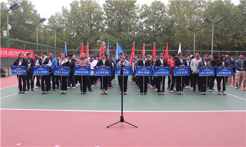 10月16日,由济南大学体育学院承办的“玲珑轮胎杯”2019山东省大学生网球锦标赛开幕式在济南大学天赐美玉网球场举行。来自山东省11所高校的名参赛队员、教练员、参加了开幕式。