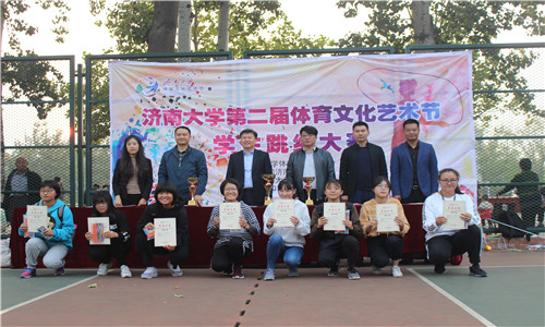 10月22日,由济南大学体育运动委员会主办,共青团济南大学委员会、济南大学体育学院承办的济南大学第二届体育文化艺术节跳绳大赛在主校区灯光排球场圆满落幕,学工处副处长李荣光,校团委副书记纪祥,体育学院党委书记杨杰,体育学院党委副书记、副院长马杰以及体育学院相关负责人出席颁奖仪式。