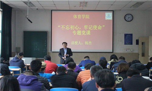 11月12日下午,体育学院在一教105教室开展“不忘初心、牢记使命”主题教育专题党课,党委书记杨杰作了题为《坚定四个自信,做四有好老师》的报告。学院党政班子、各系部负责人、在职教工党员、教职工代表等60余人共同参加。