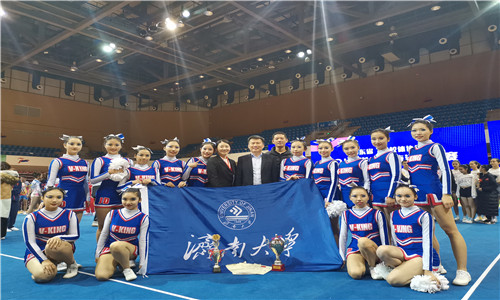 我校派出由学校党委副书记张硕秋任团长、体育学院党委书记杨杰为领队、教练员戴静及14名参赛队员组成的济南大学健美操队参加了此次赛事。获得普通院校甲组啦啦操团体赛第一名;公开青年丙组集体技巧自选动作第一名、普通院校组女子单人操第一名、技巧啦啦操自选动作第一名、爵士啦啦操自选动作第二名、有氧舞蹈三级第四名等优异成绩,戴静老师获得全国啦啦操竞赛“优秀教练员”荣誉称号。