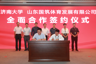 7月21日,济南大学与山东国筑体育发展有限公司全面合作签约仪式在济南大学举行。济南市市中区教体局党组成员、市中区体育事业发展中心主任韩明轩,山东国筑体育发展有限公司董事长王志军,山东国筑体育发展有限公司执行总裁都振达,山东国筑体育发展有限公司常务副总裁于海龙,济南大学校长张士强,济南大学党委副书记王玉华,学校合作发展处、体育学院相关负责同志参加仪式。仪式由王玉华副书记主持。