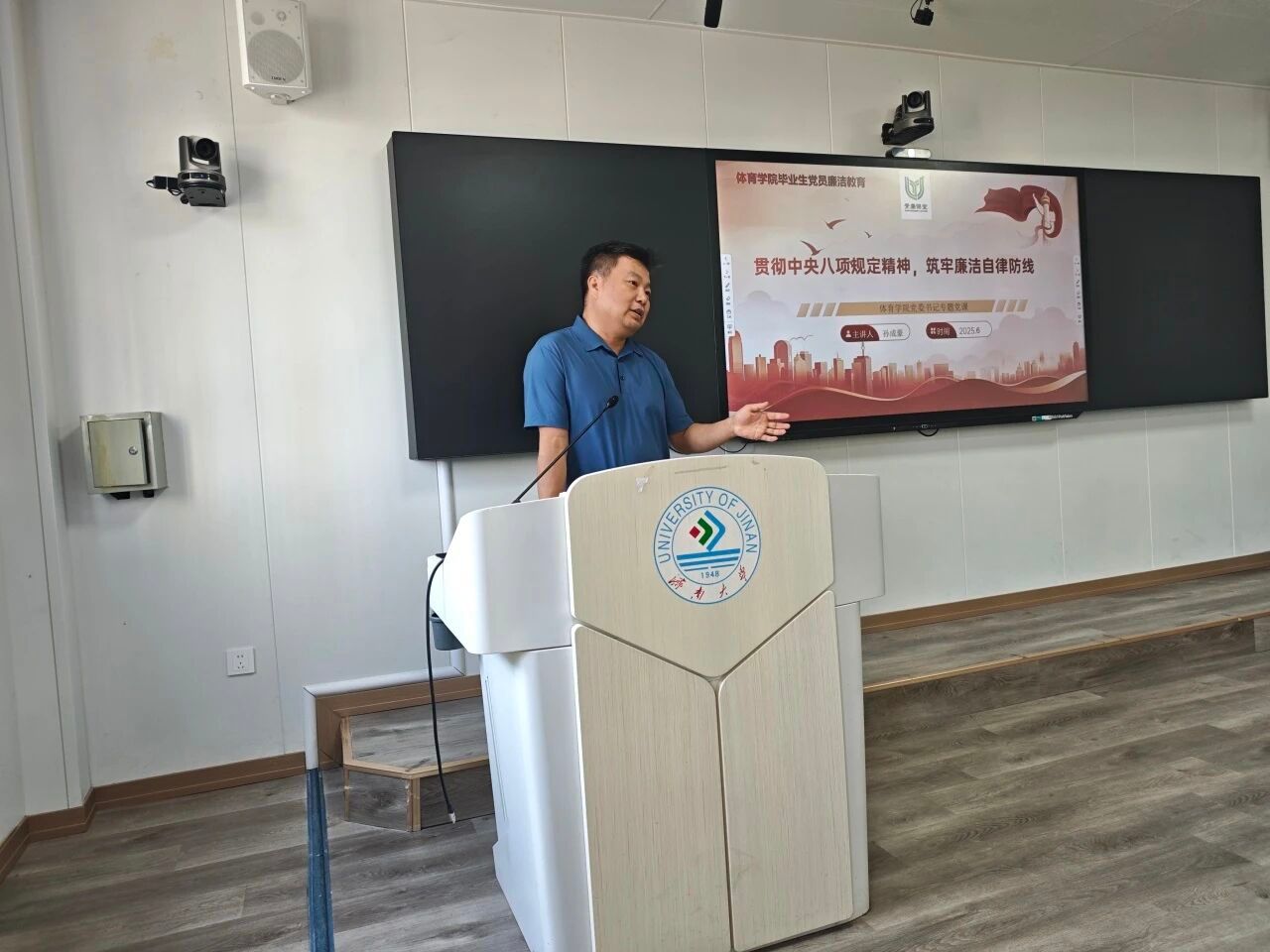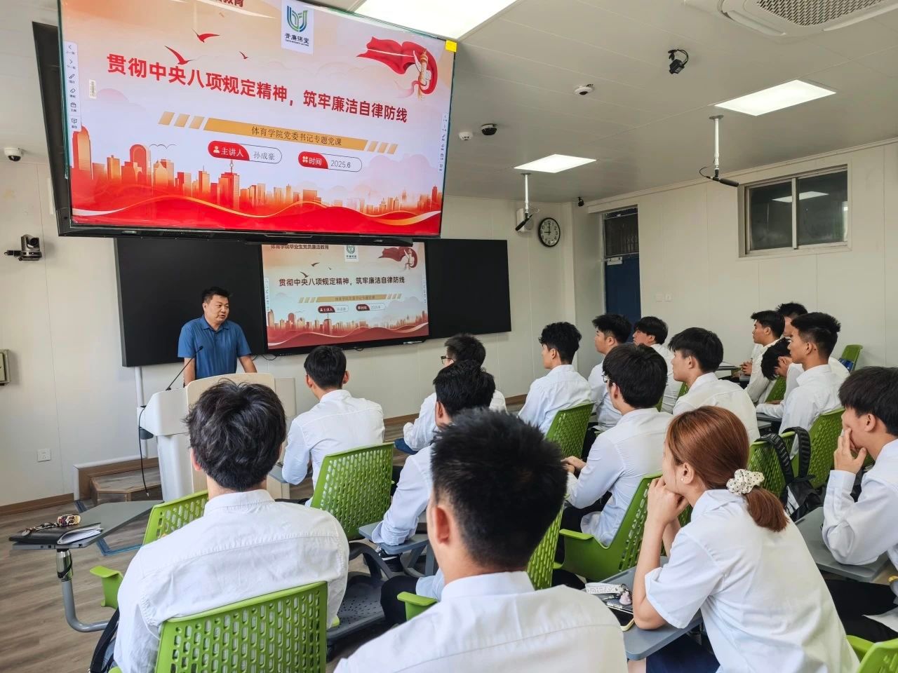 为进一步加强毕业生党员的廉洁教育,引导毕业生党员坚定理想信念,6月17日,体育学院党委书记孙成豪为毕业生党员讲授了主题为“贯彻中央八项规定精神,筑牢廉洁自律防线”的专题党课。本次党课由学院学生党支部书记王梦晗主持,全体毕业生党员参加。