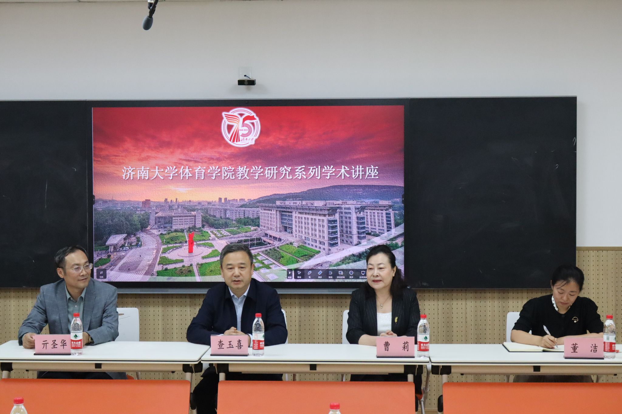 党委副书记查玉喜在致辞中向曹莉教授介绍了济南大学办学75年来,在人才培养、学科建设、科研创新、师资队伍、社会服务等方面取得的成绩,以及学校第四次党代会确定的“一二三”发展思路和“四五六”战略部署。指出学校体育工作要对标高水平大学办学理念和上级政策要求,守正创新,笃行致远,聚焦“冲一流”目标,打破常规,大胆突破,精心谋划好学院发展特色。
