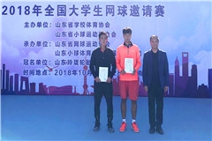 济南大学网球代表队是今年刚成立的高水平运动队。在这次比赛过程中,我校网球队在初次面对小组赛时,稳扎稳打,完胜泰山学院、山东科技大学、东北电力大学三所高校,以小组第一的名次进入八强。在半决赛时遇到男子网球团体夺冠热门的北京化工大学代表队,我校代表队赛前准备充分,并且认真分析战术,避实击虚,以2:1的分数险胜对方。决赛中又遇到整体水平都高于我们的山东体育学院代表队。赛前我们充分做好队员们的思想准备工作,抓住对方想稳中求胜的心理。赛中即使我们在遇到二号主力队员受伤的情况下,及时调整战术以2:0赢得比赛。最终济南大学网球代表队在2018年全国高校大学生网球邀请赛中荣获冠军,赛后举行了颁奖仪式,杨磊院长做为颁奖嘉宾为获得男子团体前八名的代表队颁奖。