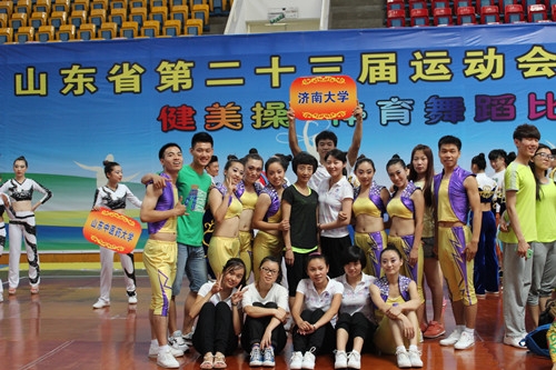 在本届比赛中,我校派队参加了健美操和啦啦操丙组的比赛;运动员是从我校体育学院学生中选拔产生。本届健美操比赛共设团体赛7个项目,我校参加了其中3个项目的比赛(有氧舞蹈、有氧踏板和男子单人);啦啦操设有3个项目,我校参加了其中1个项目的比赛(集体技巧啦啦操自选套路)。经过3天紧张激烈的比赛,我校运动员不畏强手,勇于拼搏,在参加的4个项目比赛中全部进入决赛,其中集体啦啦操自选套路获得铜牌,有氧舞蹈获得第6名,有氧踏板获得第7名,男子单人获得第7名;运动员董柔、刘丹丹、陈亚星、王晓慧同学评为“体育道德风尚奖”先进个人。对我校健美操代表队在省二十三届运动会大学组健美操和啦啦操比赛中获得的良好成绩表示热烈祝贺,同时对教练员和运动员为济南大学获得的荣誉表示衷心的感谢。